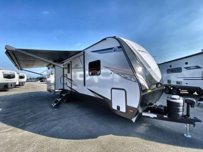 How does a king bed, a kitchen island, and an outdoor kitchen sound? You'll get all that and more in this spacious travel trailer. The dual opposing slides opens up the whole trailer, and the desk in the back will allow you to work while you're away from home. A three burner cooktop and microwave oven comes standard indoors, along with plenty of counter space and a pantry for snacks. Head outdoors to find the outside kitchen under the 21' power awning with LED lights, and when you're ready for bed the king bed will be waiting for you!