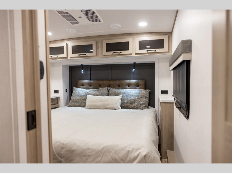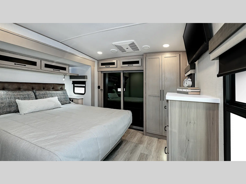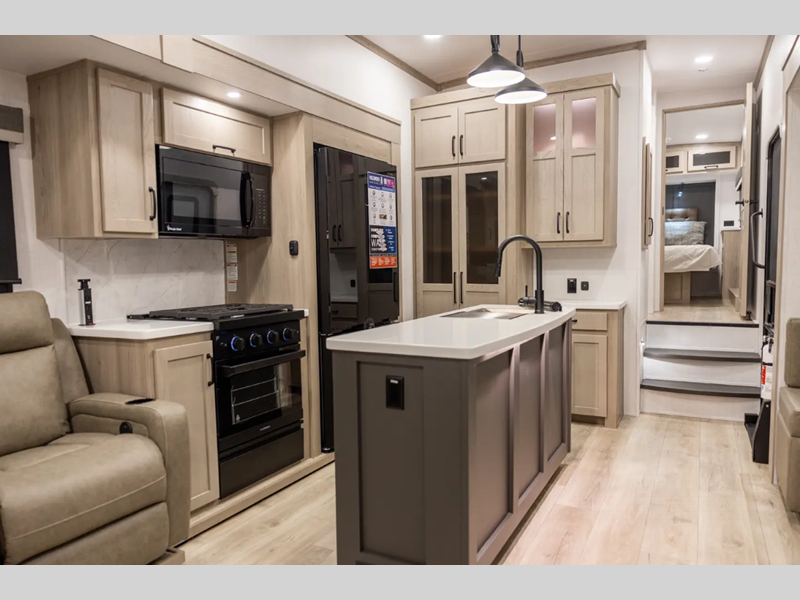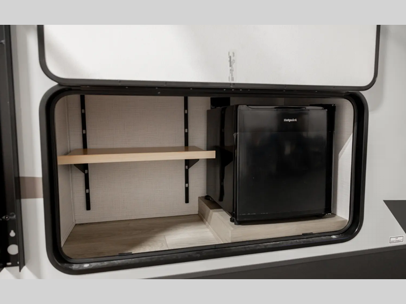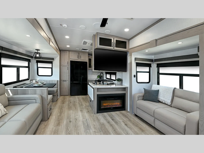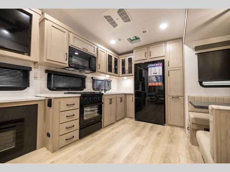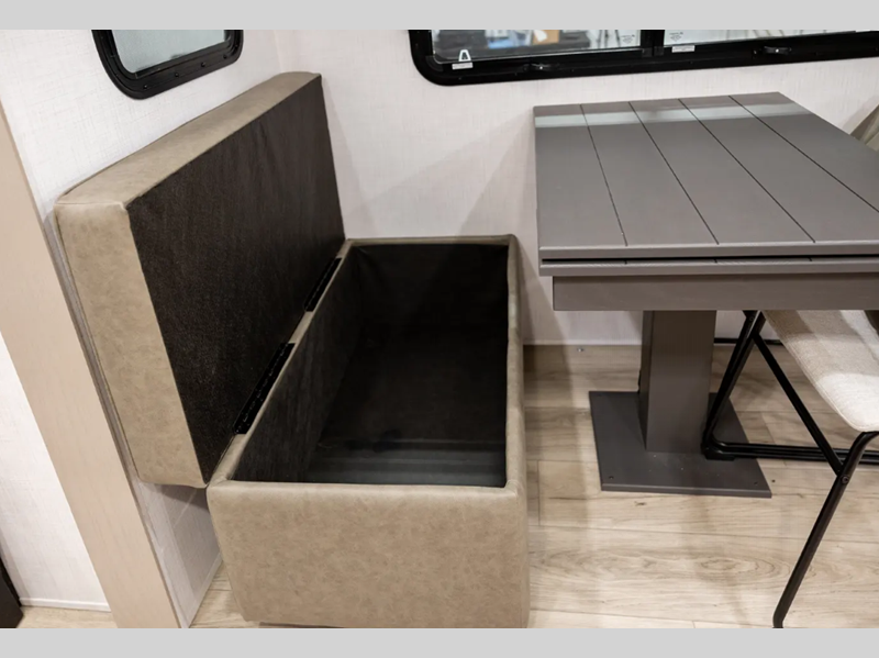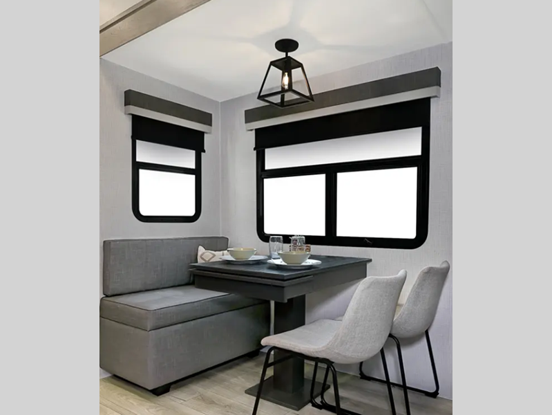 Outside, you'll find a power awning with an adjustable rain dump and LED lighting, backup camera pre, Keyed Alike locks, plus many more conveniences. The enclosed underbelly will help extend your camping season, and you can enjoy your RV for years thanks to the durable construction materials, like the radiant foil insulation and 5/8" plywood tongue and groove subfloor. Each fifth wheel and travel trailer also includes lino flooring in all slides, aluminum dinette, bed and bunk, plus solid surface kitchen countertops.