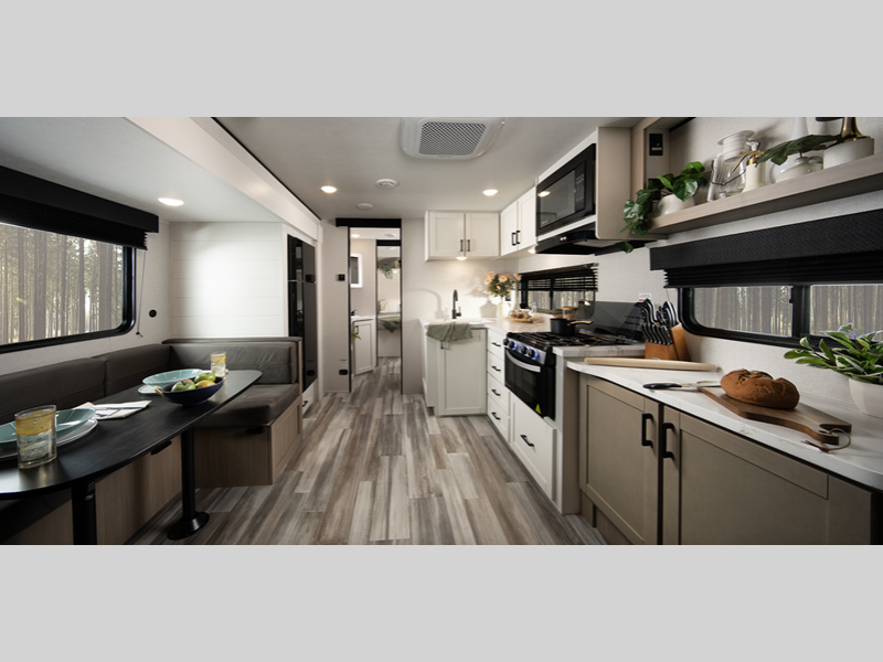 Each model is constructed with a Magnum Truss roof system, which is one of the strongest roofs in the industry, capable of withstanding 50% more weight. The axle(s) with electric, self-adjusting brakes and easy-lube hubs will make towing easier than ever, and the stabilizer jacks will give you peace of mind as you set up camp. Inside, you'll love the residential-style kitchen countertops and vinyl flooring throughout, plus there is an on-demand tankless water heater on board for hot water when you need it!