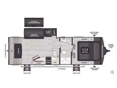 Sleeps 6 Slides 1 Length 29 ft 10 in Ext Height 11 ft 3 in Hitch Weight 820 lbs Dry Weight 6460 lbs Cargo Capacity 2340 lbs Fresh Water Capacity 54 gals Grey Water Capacity 76 gals Black Water Capacity 38 gals Tire Size ST225/75R15E Furnace BTU 30000 btu Available Beds King Refrigerator Type 12V Refrigerator Size 10.4 cu ft Cooktop Burners 3 Number of Awnings 1 LP Tank Capacity 30 lbs Water Heater Type Tankless On Demand AC BTU 15000 btu TV Info LR LED HDTV Awning Info 18' Electric w/Gas Strut Arm w/Dotless Neon Lighting Axle Count 2 Number of LP Tanks 2 Shower Type Standard Electrical Service 50 amp Similar Travel Trailer Floorplans