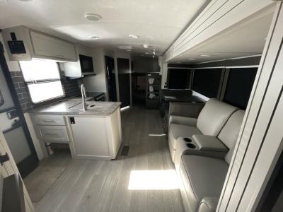 With dual entry doors in this travel trailer, you can enter in through the main living area or the full bath for convenience! Once inside, the sleeper sofa and booth dinette provide places to relax, eat, and play games, plus there is an entertainment center with hidden storage behind to keep movies organized. A full kitchen with a three burner cooktop and 12V refrigerator will allow you to cook and store food, or you can head outdoors to utilize the outdoor kitchen prep area. There is also drop-frame storage outside for fishing poles and hiking gear, and the 21' electric awning provides shade as you relax. When it's time to call it a night, the king bed in the front private bedroom is sure to bring comfort, while the little ones take the double-size bunks, and any other guests can sleep on the living room furniture!
