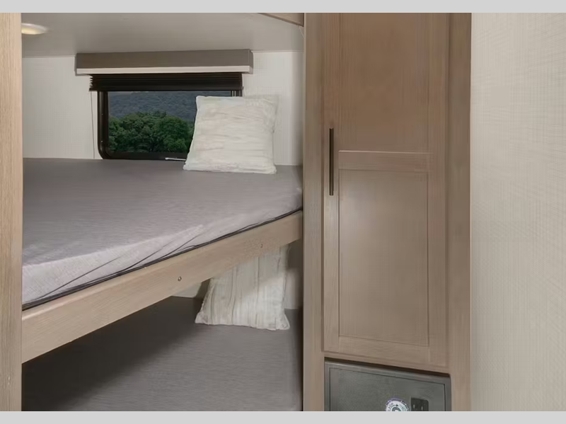 There is a Road Armor shock absorbing hitch pin for smooth towing and an engineered structural I-beam chassis with stamped steel cross-members and outriggers for added strength. You'll feel right at home with pleated privacy shades, residential, shaker style hardwood cabinet doors, and seamless pressed countertops.
