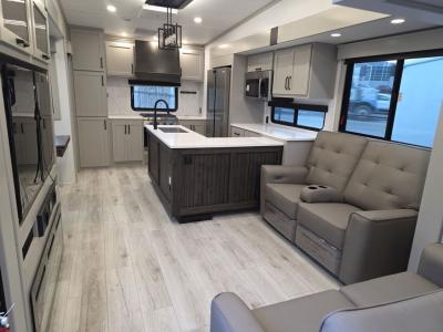 Sleeps 5 Slides 3 Length 36 ft 7 in Ext Height 13 ft 4 in Interior Color Arlington, Kingston Hitch Weight 2410 lbs Dry Weight 12245 lbs Cargo Capacity 3740 lbs Fresh Water Capacity 75 gals Grey Water Capacity 87 gals Black Water Capacity 49 gals Tire Size ST235/80R16G Furnace BTU 35000 btu Available Beds King Refrigerator Type GE Energy Star Residential with Ice Maker Refrigerator Size 18 cu ft Cooktop Burners 3 Number of Awnings 1 Axle Weight 7000 lbs LP Tank Capacity 30 lbs Water Heater Type On Demand AC BTU 15000 btu TV Info LR 50" LED Smart TV Awning Info 17' Electric with LED Lights Axle Count 2 Washer/Dryer Available Yes Number of LP Tanks 2 Shower Type Shower w/Seat Electrical Service 50 amp Similar Fifth Wheel Floorplans