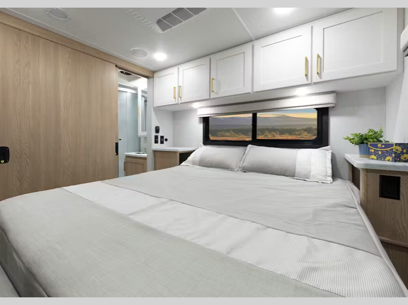 A Ford E-Series chassis or optional Chevy chassis on select models will get you to your destination with ease. There is also a touchscreen dash radio and a back-up monitor to easily park once you're there. You'll appreciate the lighted rotocast storage compartments with lights outside, along with a power awning with LED lights and drop down stairwell entrance step with an accent light. Inside, you'll feel right at home with residential vinyl flooring, premium window privacy shades, and pressed laminate countertops throughout!
