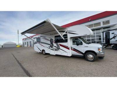 Sleeps 6 Slides 1 Length 30 ft Ext Width 8 ft 3 in Ext Height 11 ft Int Height 7 ft Interior Color Nantucket Blue ll, Sunlit Silver Exterior Color Standard Graphics Hitch Weight 8000 lbs GVWR 14500 lbs Fresh Water Capacity 40 gals Grey Water Capacity 40 gals Black Water Capacity 27 gals Furnace BTU 30000 btu Generator 4.0 kW Gas Fuel Type Gasoline Engine 7.3L V8 Chassis Ford E Series Horsepower 325 hp Fuel Capacity 55 gals Wheelbase 212 in Number Of Bunks 1 Available Beds RV Queen Torque 450 ft-lb Refrigerator Type 12V w/Auto Generator Start Cooktop Burners 3 Shower Size 24" x 36" Number of Awnings 1 LP Tank Capacity 40.9 lbs Water Heater Type Tankless AC BTU 15000 btu Basement Storage 104.2 cu. ft. TV Info Mid-Ship 40" Smart TV Awning Info 14' Power w/Integrated LED Lighting Gross Combined Weight 22000 lbs Shower Type Standard Electrical Service 30 amp Similar Motor Home Class C Floorplans