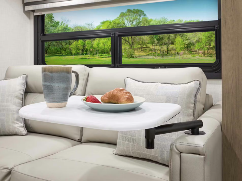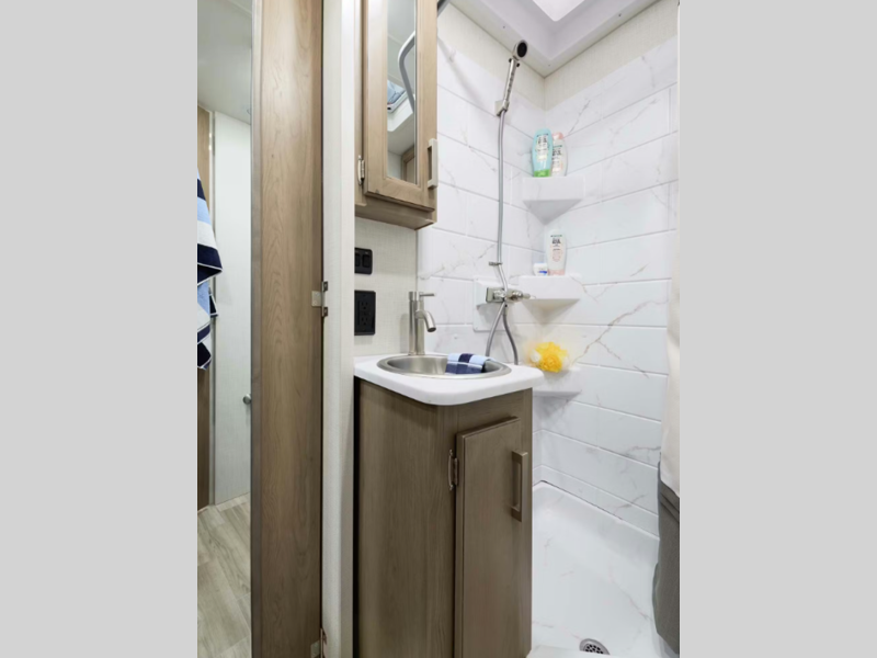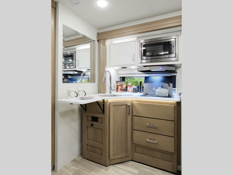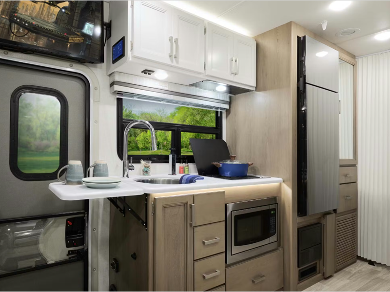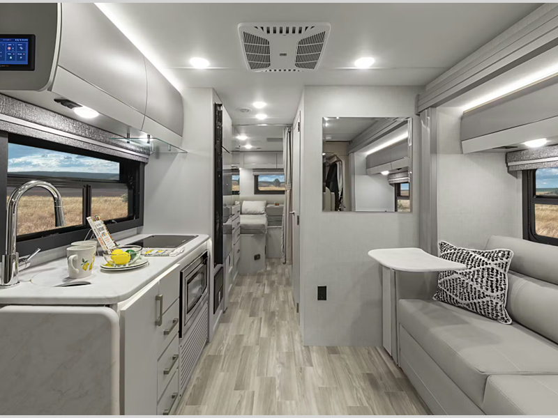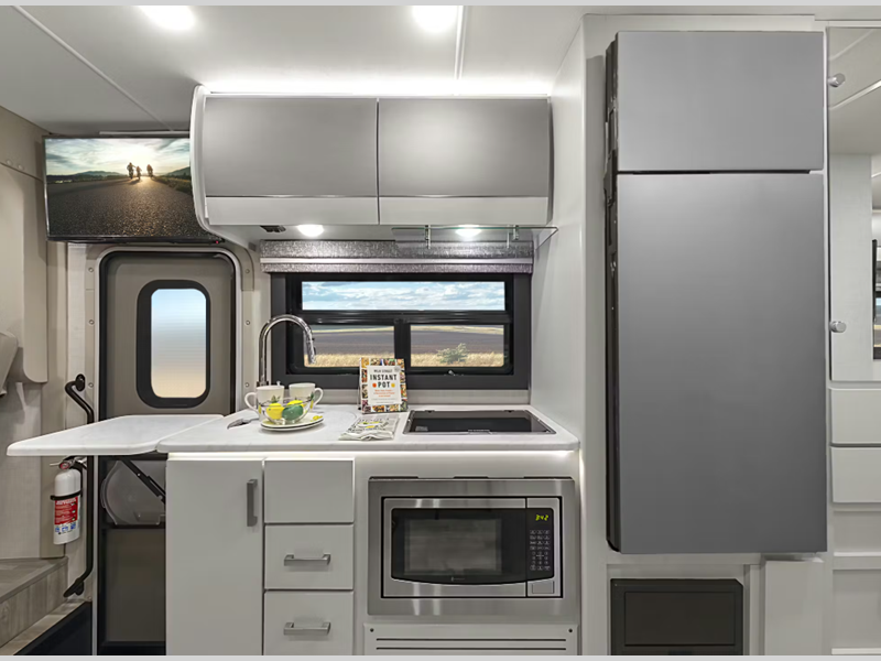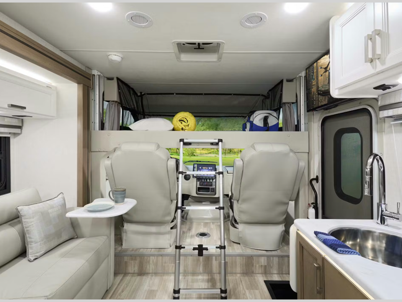 The 14" touchscreen dash radio in the cab comes with Bluetooth, Android Auto, and Apple CarPlay, and it is ready for SiriusXM radio. The reclining/swivel leatherette captain's chairs are super comfortable, and they can even serve as an additional lounge spot for the rest of the living area when you swivel them around. The Vegas kitchen is ready to help you make meals on the go, and you will find the 12V double-door refrigerator, two-burner gas cooktop, and convection microwave to be quite useful. You will also appreciate the durable premium one-piece domed roof membrane, the 15,000 BTU A/C, and the tankless water heater for endless hot water when you need it.