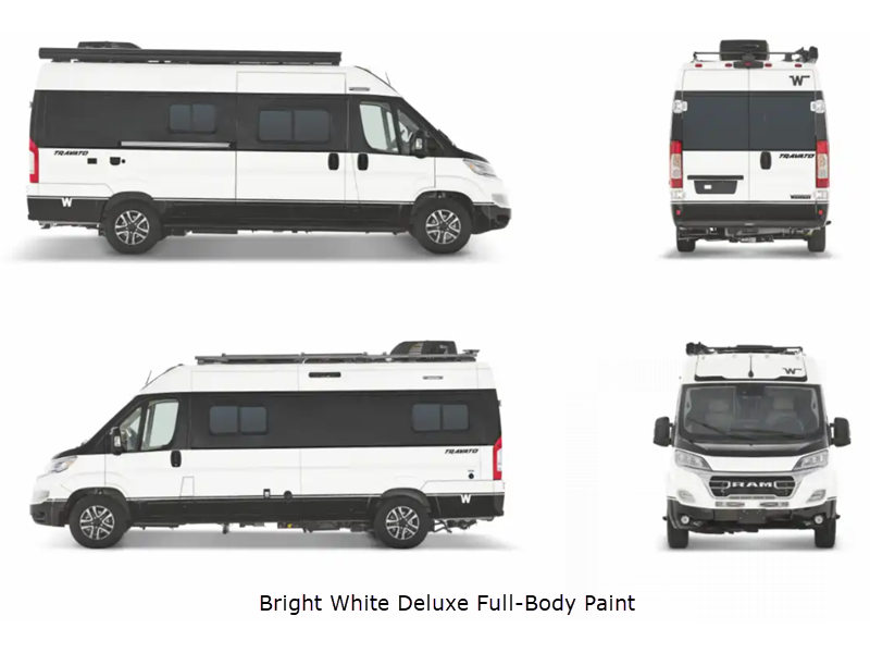 Sleeps 2 Length 21 ft Ext Width 6 ft 9 in Ext Height 9 ft 4 in Int Height 6 ft 3 in Interior Color Bleu with Walnut, Bleu with Walnut and White, Bleu with Weathered Teak Exterior Color Full Body Paint, Deluxe Full Body Paint Choices; Bright White, Bright Silver, Ceramic Gray, Sandstone Hitch Weight 3500 lbs GVWR 9350 lbs Fresh Water Capacity 18 gals Grey Water Capacity 12 gals Black Water Capacity 12 gals Fuel Type Gasoline Engine 3.6L V6 Chassis Ram ProMaster Horsepower 280 hp Fuel Capacity 24 gals Wheelbase 159 in Available Beds Two Twin Refrigerator Type Single Door Compressor Driven Refrigerator/Freezer 12V Refrigerator Size 4.3 cu ft Convection Cooking Yes Cooktop Burners 1 Shower Size 25" x 43" Number of Awnings 1 Axle Weight Front 4629 lbs Axle Weight Rear 5291 lbs LP Tank Capacity 25 lbs Water Heater Capacity 2.6 gal Water Heater Type Truma Combi Eco Plus TV Info Coach 24" HDTV Awning Info 13' Rack Mounted Power with LED Lighting and Bluetooth Control Gross Combined Weight 12000 lbs Shower Type Wet/Bath Shower Electrical Service 30 amp Similar Floorplans