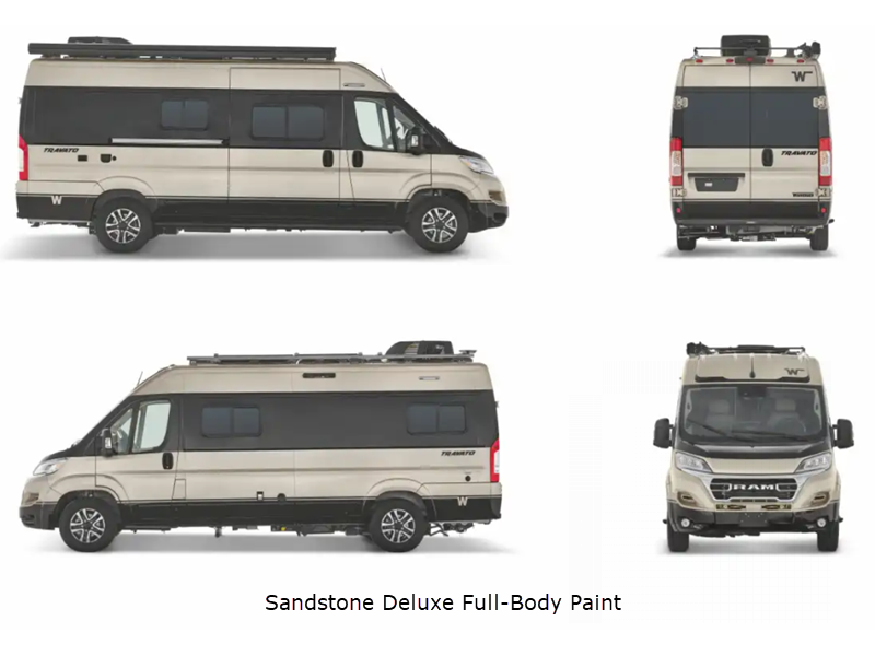 Sleeps 2 Length 21 ft Ext Width 6 ft 9 in Ext Height 9 ft 4 in Int Height 6 ft 3 in Interior Color Canyon with Soft Oak, Cashmere with Weathered Teak II Exterior Color Full Body Paint, Deluxe Full Body Paint Choices; Bright White, Bright Silver, Ceramic Gray, Sandstone Hitch Weight 3500 lbs GVWR 9350 lbs Fresh Water Capacity 18 gals Grey Water Capacity 14 gals Black Water Capacity 11 gals Generator 2,800W Gas Fuel Type Gasoline Engine 3.6L V6 Chassis Ram ProMaster Horsepower 280 hp Fuel Capacity 24 gals Wheelbase 159 in Available Beds Double Refrigerator Type Two Door Compressor Driven Refrigerator/Freezer 12V Refrigerator Size 6 cu ft Cooktop Burners 2 Shower Size 28" x 51" Number of Awnings 1 Axle Weight Front 4629 lbs Axle Weight Rear 5291 lbs LP Tank Capacity 25 lbs Water Heater Capacity 2.6 gal Water Heater Type Truma Combi G Comfort Plus TV Info Coach 24" HDTV Awning Info 13' Rack Mounted Power with LED Lighting and Bluetooth Control Gross Combined Weight 12000 lbs Shower Type Wet/Bath Shower Electrical Service 30 amp -